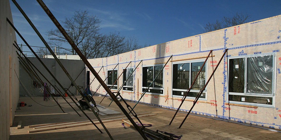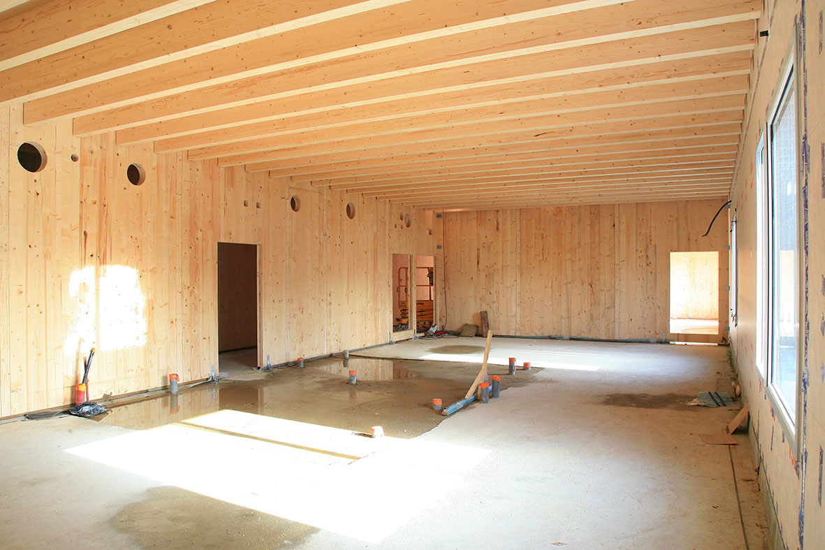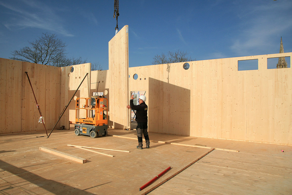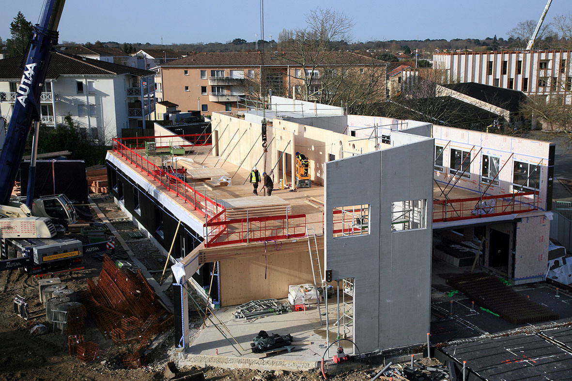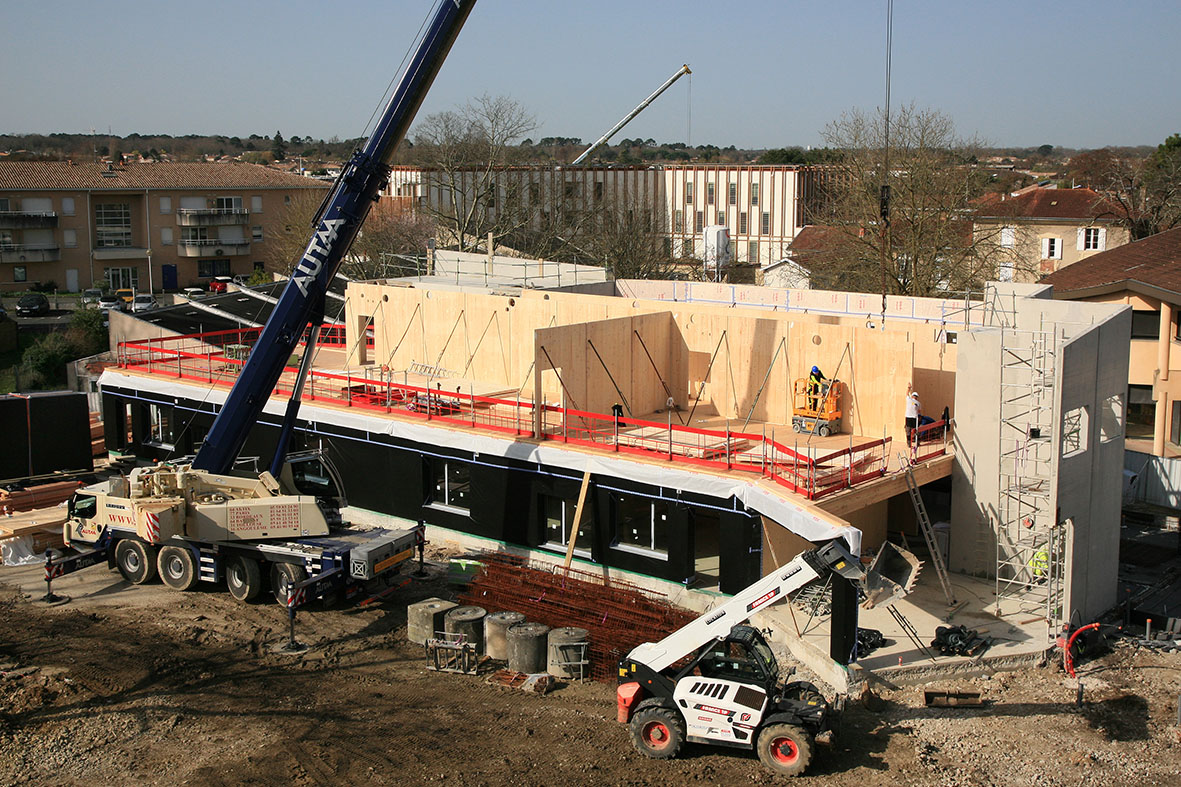 Le premier étage de la future école maternelle prend forme, avec une ossature et un plancher en bois.